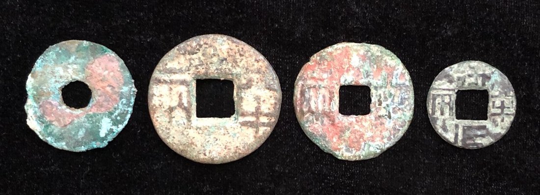 中國古錢擬舊仿制品4枚一組,包括環錢,半兩及複打半兩等,GF品相,售後不設退換。