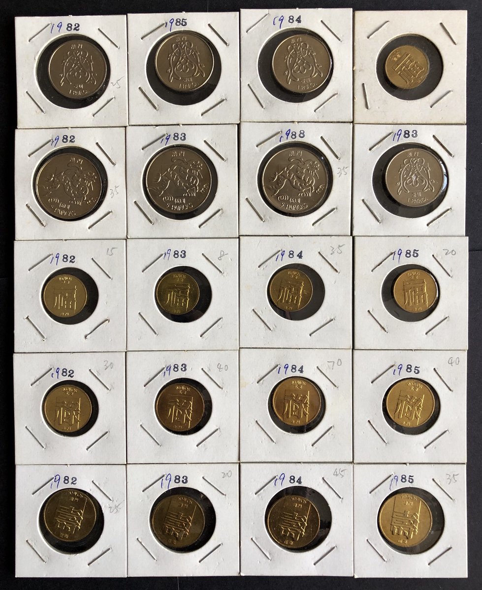 1980年代澳門錢幣20枚一組,包括黃銅幣1毫‘福’5枚,2毫‘祿’4枚,5毫‘壽’4枚,以及銅鎳幣1元4枚及5元3枚,共20枚,大致UNC品相。