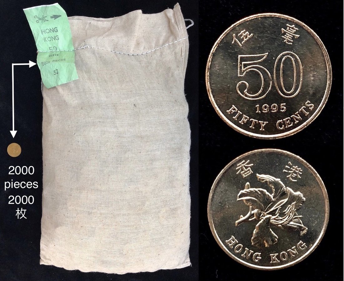 1995年香港5毫2000枚一組,總面額1000元,UNC品相,存於原裝麻布袋。