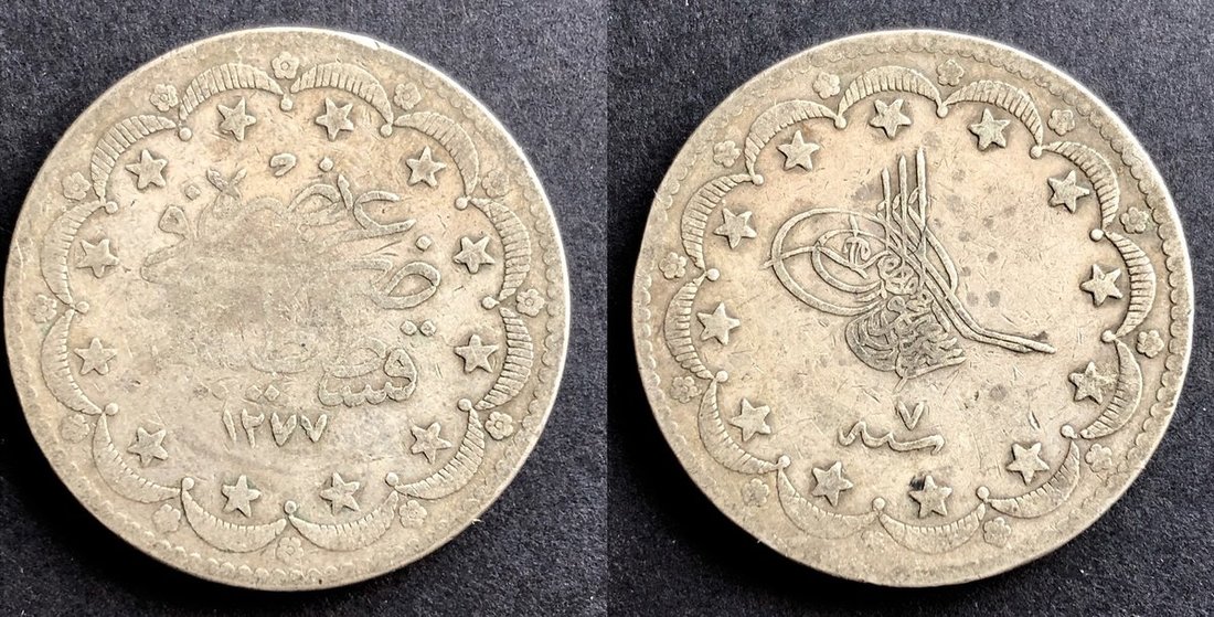 1861年(AH1277(7))土耳其20庫魯斯銀幣,VF品相。