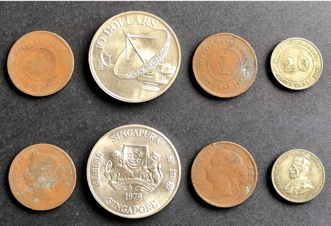 1888-1979年4枚錢幣一組包括海峽殖民地1888及1895年1仙青銅幣及1919年2毫銀幣,另外1979年新加坡10元銀幣,前三枚F至VF品相,最後一枚AU至UNC品相。