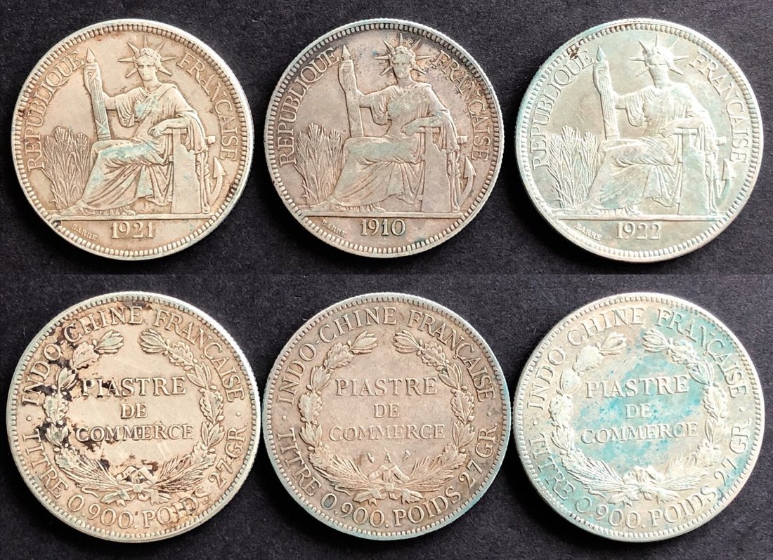 1910-1922, French Indo-China, a group of 3x silver Piastre de Commerce, 1910, 1921 and 1922, circulated in regions such as China's Yunnan, Kwangsi and Kwangtung provinces, very fine with oxidation, particularly the 1922 coin.