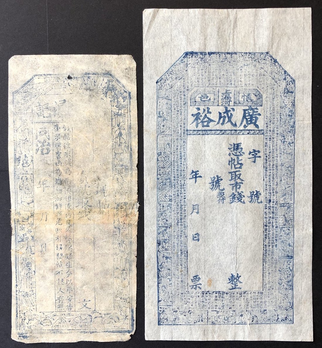 同治年(1862-1874年)山西省未使用錢莊票,以及無日期廣成裕未使用票,共2枚一組,前者F品相,中心有修補,後者EF品相。