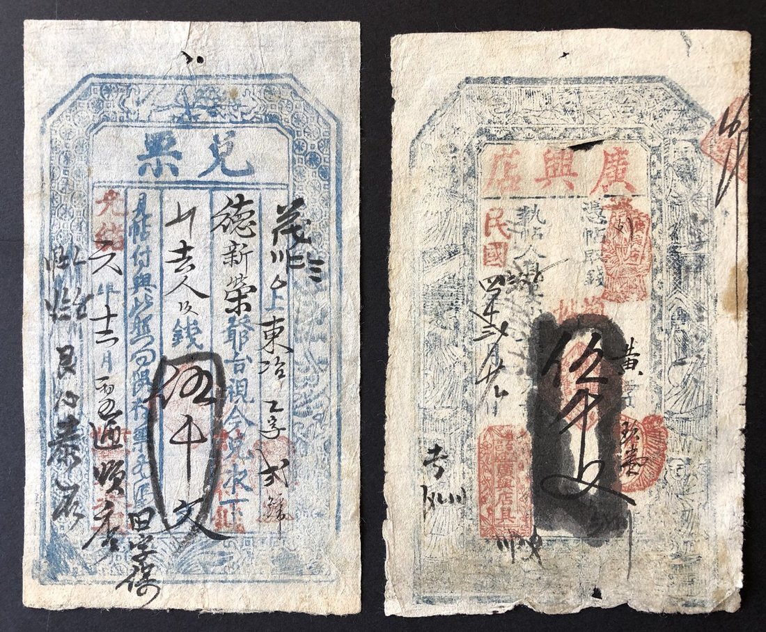 光緒元年(1875年)山西豐棠具兌票5000文及1915年廣興店具5000文,前者AVF品相,後者F品相。