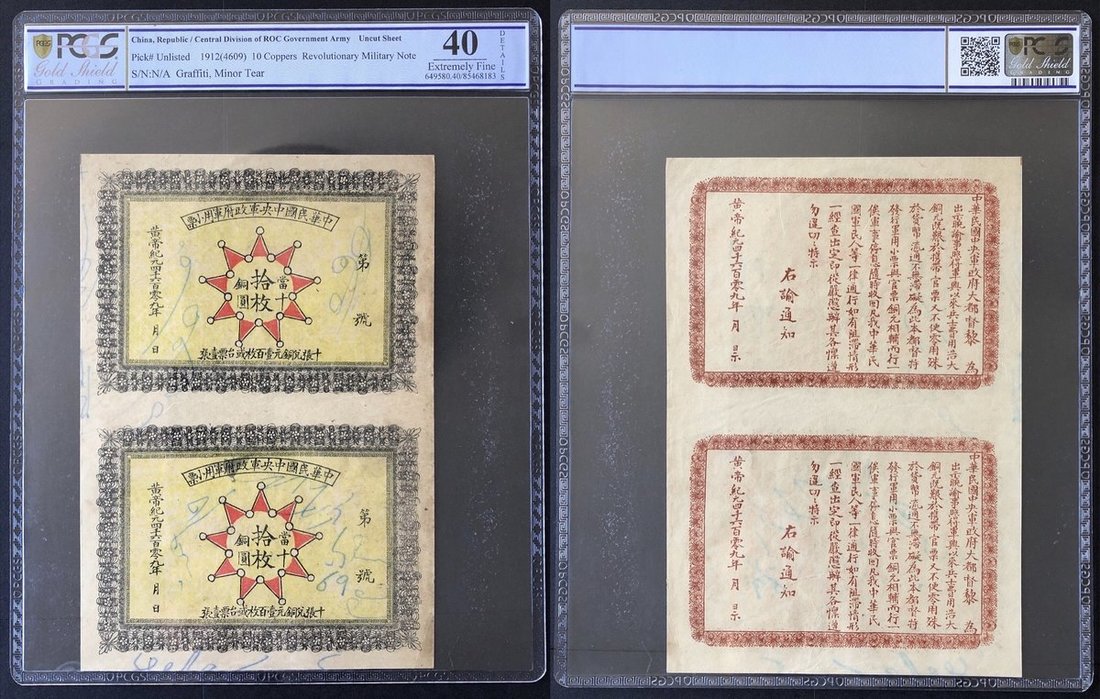 1912, Republic of China Central Division of Government Army, Revolutionary Military Note, an uncur pair of 10 coppers, (Pick unlisted), PCGS Gold Shield 40 Extremely Fine (Graffiti, Minor Tear).