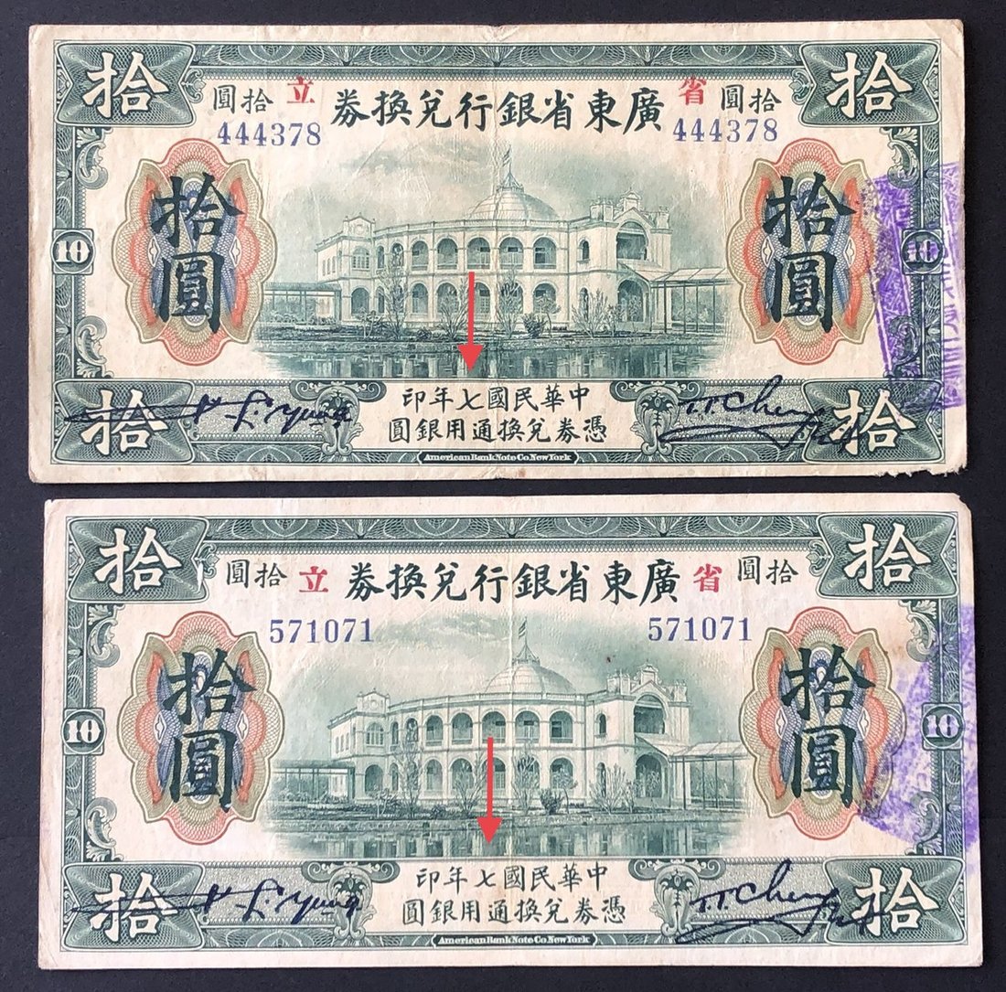 1918年廣東省銀行兌換券10元2枚一組,大‘七’字及小‘七’字版別,VF至EF品相。