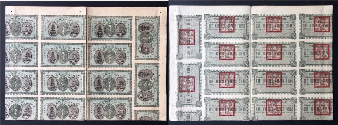 1924年四川官錢局1000文14枚連體票,包括有完整及部分印刷,有打孔,AEF品相。