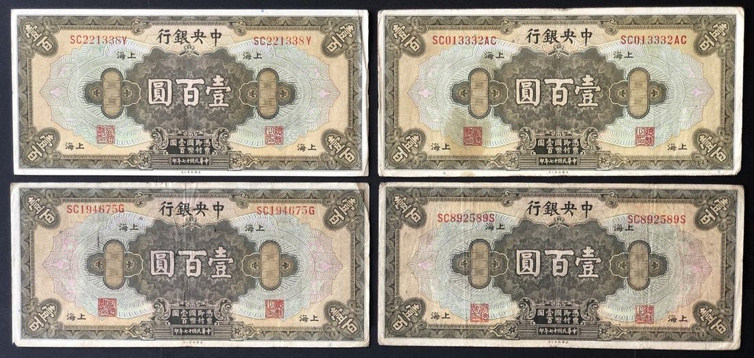 1928年中央銀行100元4枚一組,上海地名,AF至EF品相,其中一枚背面有書寫。