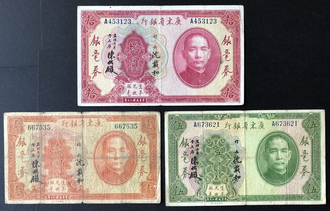 1931, The Kwangtung Provincial Bank, $1, $5 and $10, Chen You Xuan signature at left, (Pick S2421b, S2422b, S2423b), very fine.