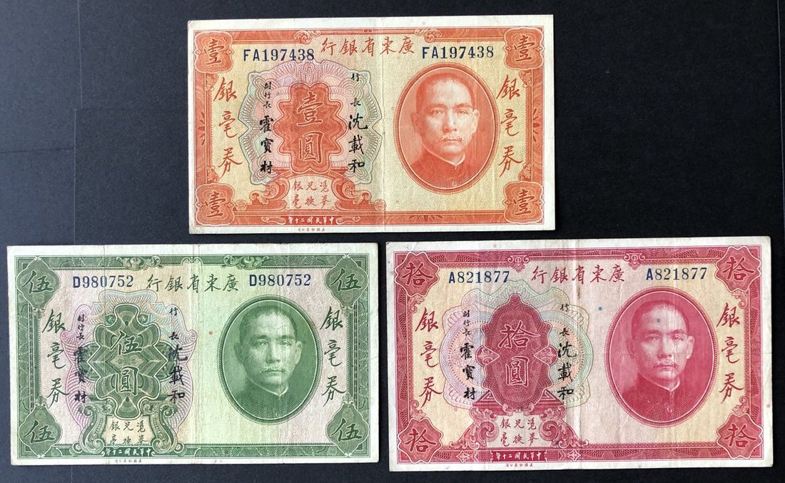 1931, The Kwangtung Provincial Bank, $1, $5 and $10, Huo Bao Cai signature at left, (Pick S2421a, S2422a, S2423a), very fine.