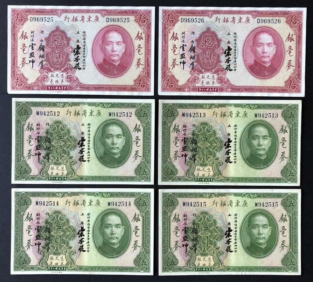 1931年廣東省銀行5元4枚及10元2枚,5元均AU品相中間有軟折,10元均AU至UNC品相。