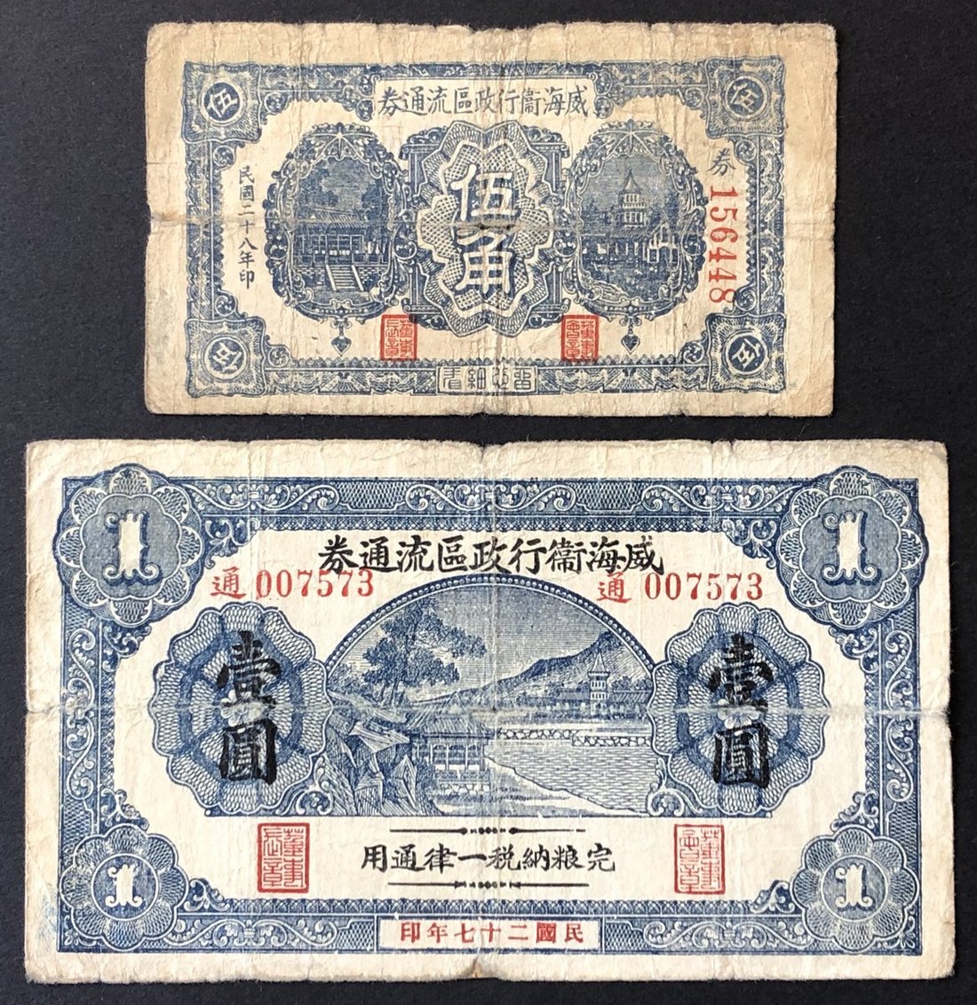 1938及1939年威海衛行政區流通券1元及5角,編號分別為‘通’字007573及156448,F品相。