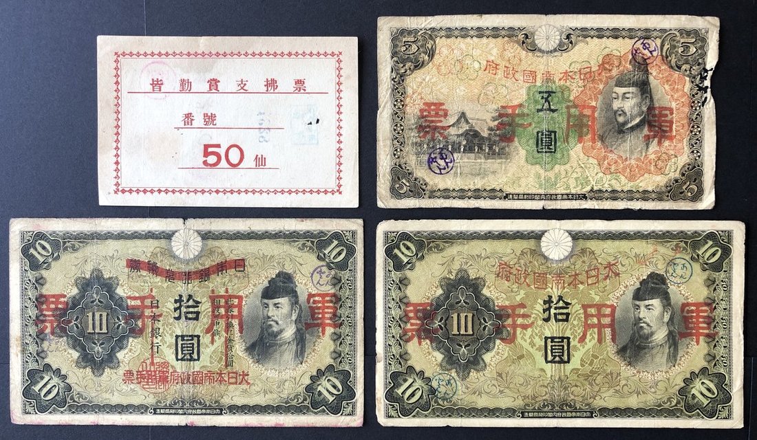 1938年日本銀行大日本帝國政府軍用手票加蓋10元3枚,於中國流通,加蓋日文“廣東”,以及皆勤賞支拂票50仙,VG至VF品相。