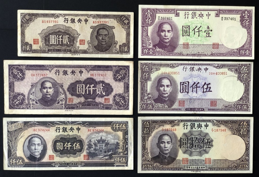 1940年代中央銀行紙幣6枚一組,包括1944年50元,1942年1000元,1945年2000元2枚,以及1945年及1947年5000元2枚,50元,1000元及1847年5000元AU至UNC品相,其他則EF品相。