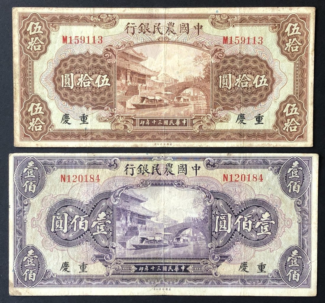 1941年中國農民銀行50及100元,重慶地名,編號M59113及N120184,F至VF品相。
