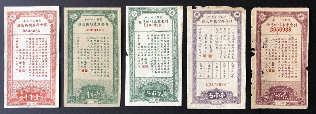 1942-1944, Ration Exchange Certificates, group of 5, issued for use in Szechuan, fine to very fine.
