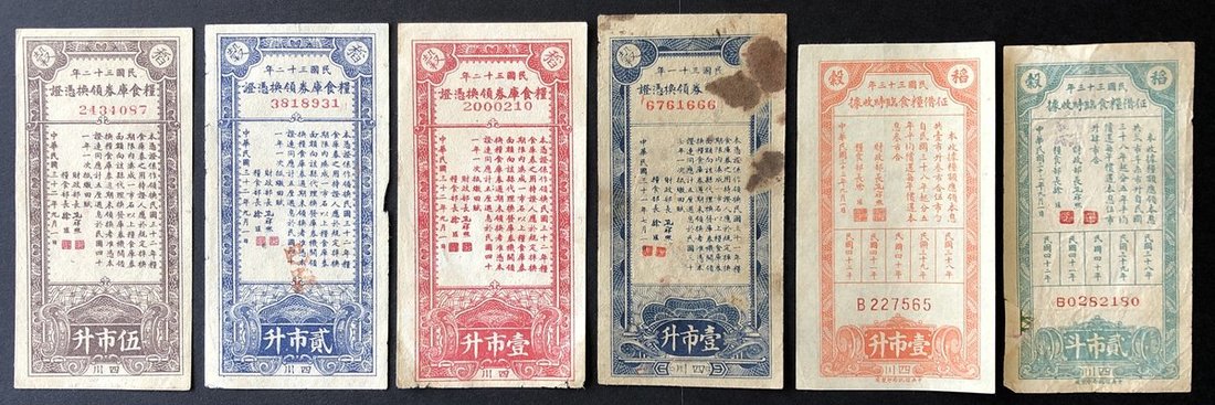 1942-1944, Ration Exchange Certificates, group of 6, issued for use in Szechuan, fine or better.