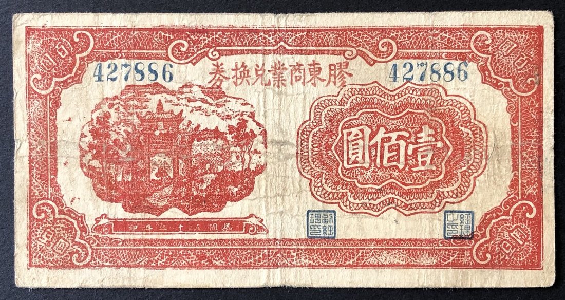1943年膠東商業兌換券100元,編號427886,AF品相。