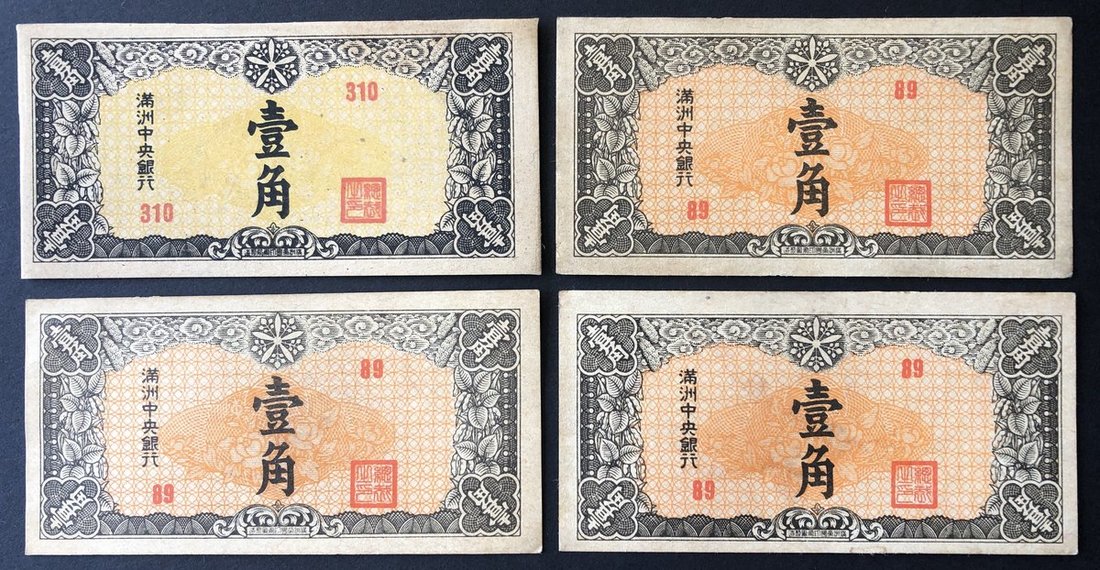 1944, The Central Bank of Manchukuo, group of 4x 1 chiao, (Pick J140), about uncirculated to uncirculated.
