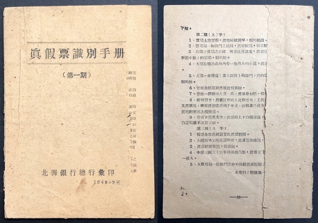 1948年北海銀行總行彙印《真假票識別手冊(第一期)》,VF至EF品相,保存相當完好,解放區鈔發行銀行印刷的文獻,有趣及少見。