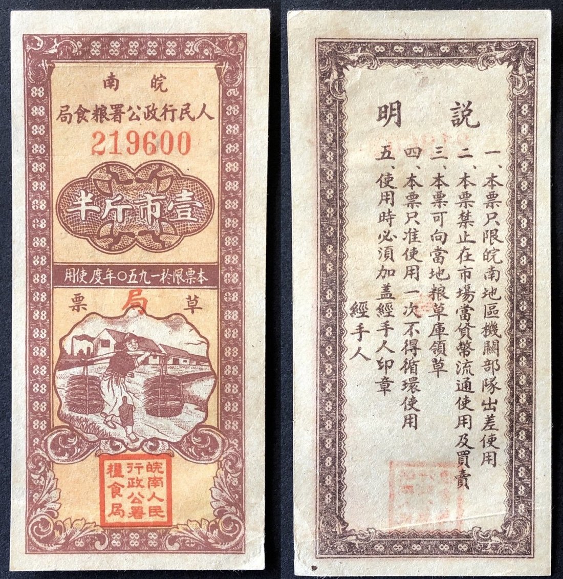 1950年皖南人民行政公署糧食局1市斤半,編號219600,EF至AU品相。