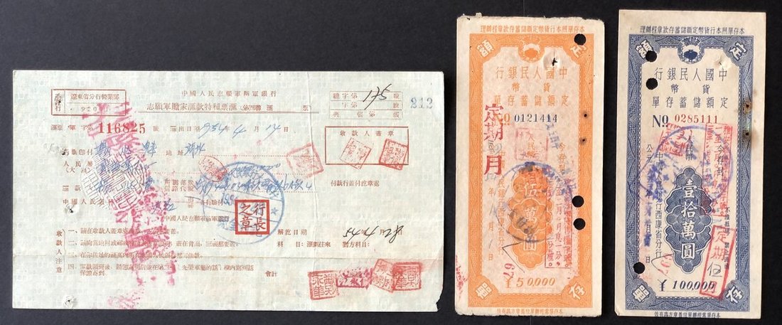 1954-1955, People's Bank of China, a pair of fixed deposit receipts, 50000 Yuan and 100000 Yuan, also 1954, People's Volunteer Army Bank, 200000 Yuan cashier's check, very fine.
