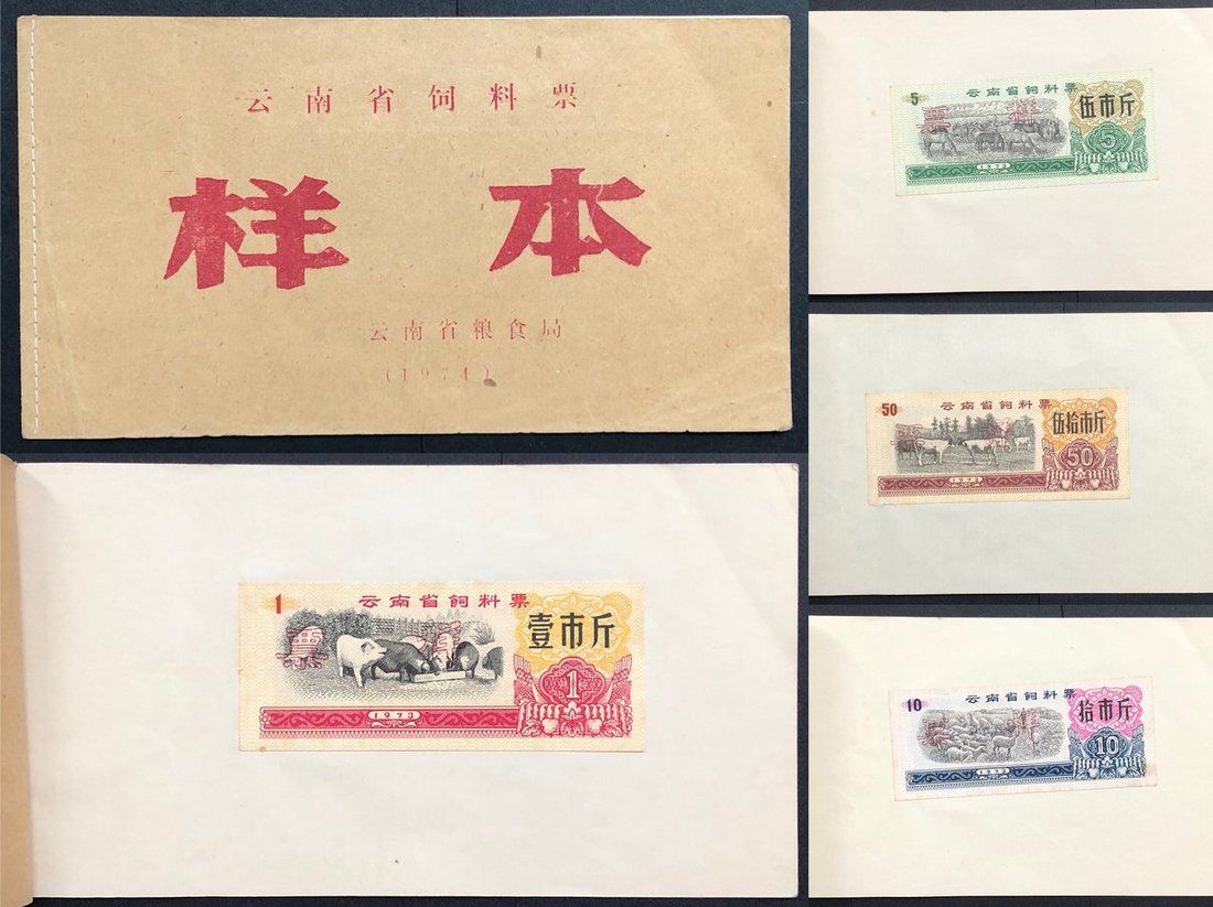 1973/74, Yunnan Province Animal Feed Ration Coupons, 1, 5, 10 and 50 catty specimen, about uncirculated with stains, enclsoed in original booklet.