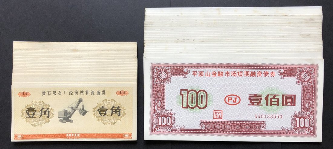 1980, Huang Shi Mineral Factory Accountance Circulating Notes, 30x 1 Jiao, also Ping Ding Shan Financial Market Short Term Financial Bonds, 30x 100 Yuan, uncirculated.