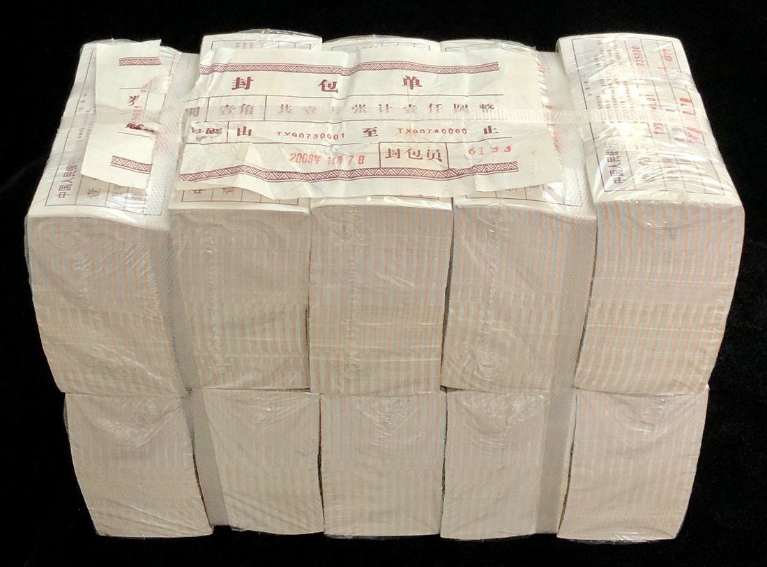1980, People's Bank of China, 4th series renminbi, a large group of 10,000x 1 jiao, total face value of 1000 Yuan, two letter serial prefix, (Pick 881a), uncirculated, in original bulk packaging. (RELISTED IN CSS51)
