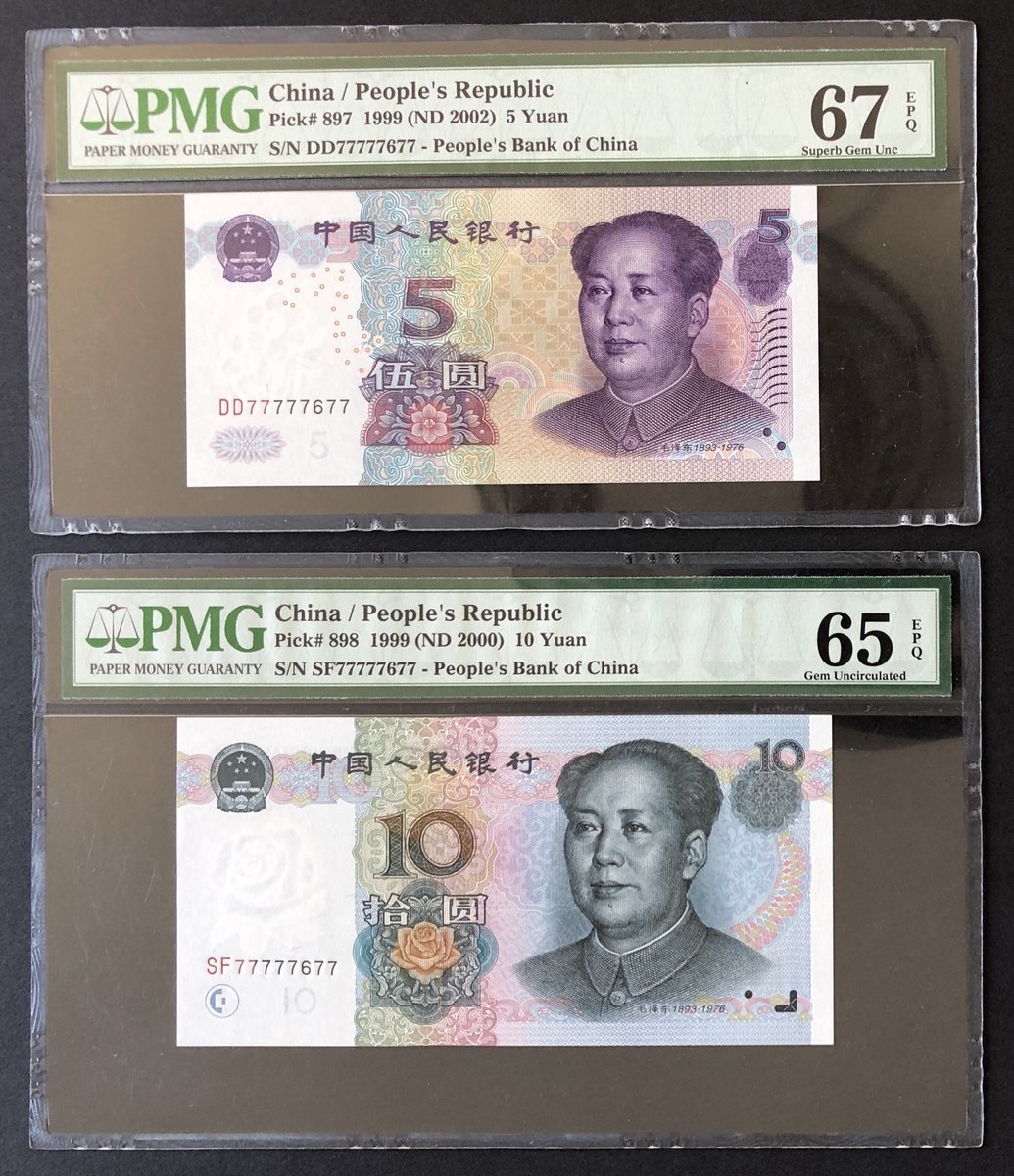 1999 and 2005, People's Bank of China, 5th series renminbi, a pair of 10 Yuan and 5 Yuan respectively, matching near-solid serial numbers SF77777677 and DD77777677, (Pick 898, 897), graded PMG 65EPQ and 67EPQ respectively.
