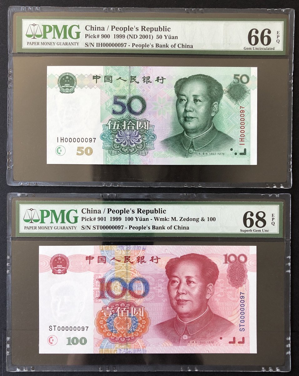 1999年中國人民銀行五版人民幣50元及100元2枚一組,相符細號字軌IH00000097及ST00000097,分別評PMG 66EPQ及68EPQ。