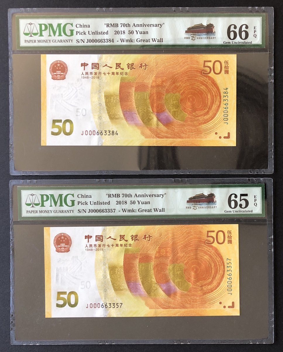 2018年中國人民銀行50元2枚一組,人民幣發行70周年紀念版,編號J000663357及J000663384,分別評PMG 65EPQ及66EPQ。