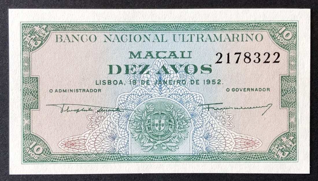 1952, Macau, Banco Nacional Ultramarino, 10 Avos, serial number 2178322, (Pick 42), uncirculated.