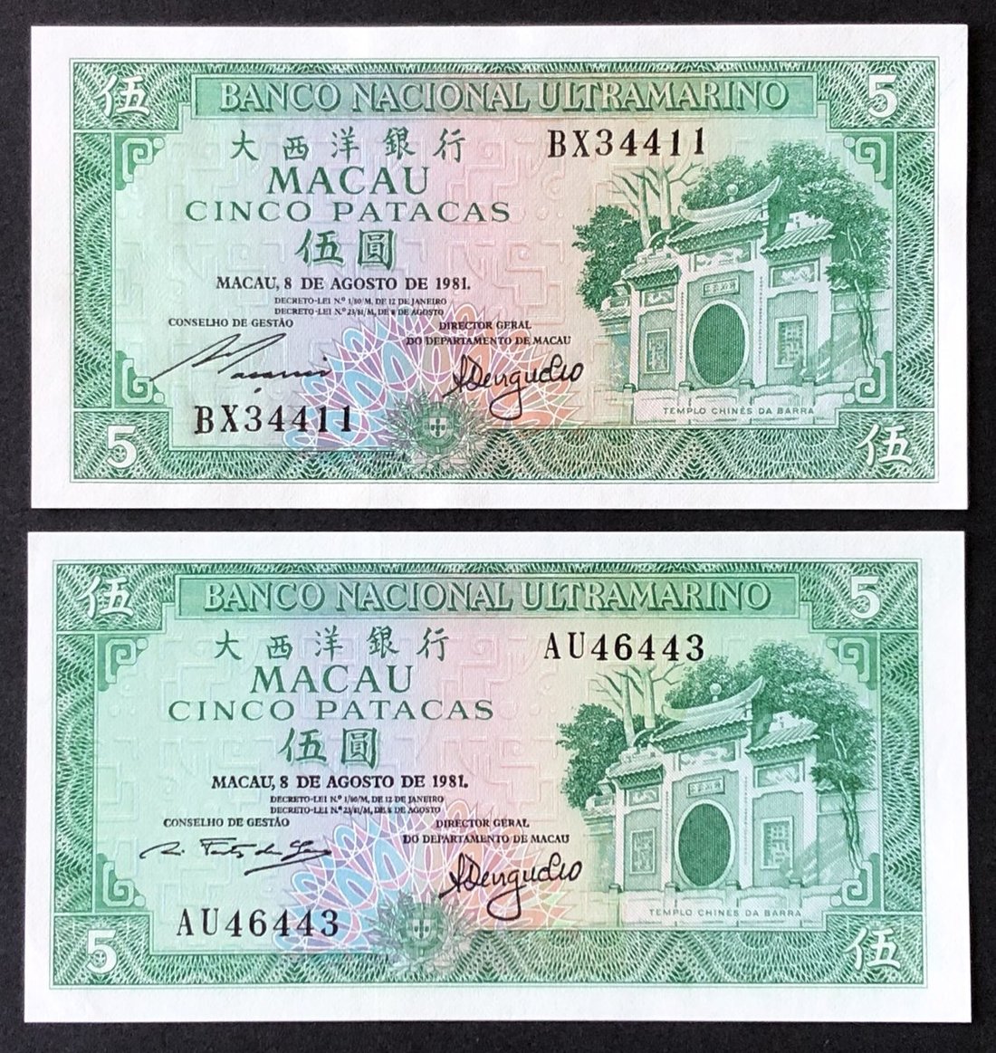 1981, Macau, Banco Nacional Ultramarino, a pair of 5 Patacas, serial numbers AU46443 and BX34411, (Pick 58c), the former about uncirculated, crease at lower left corner, the latter uncirculated.