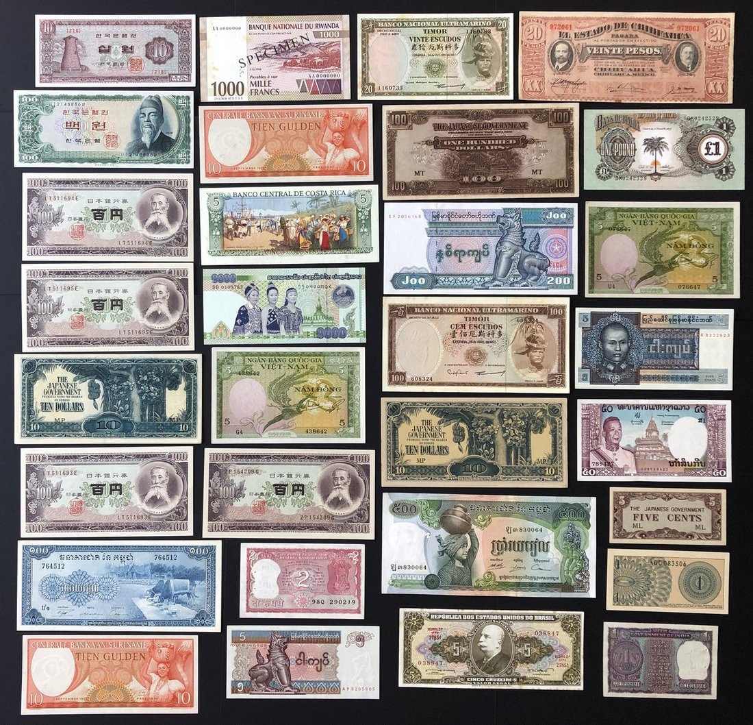 1910-1990年代世界紙幣38枚一組,主要為20世紀中期及後期紙幣,品相不一,VF至UNC品相。