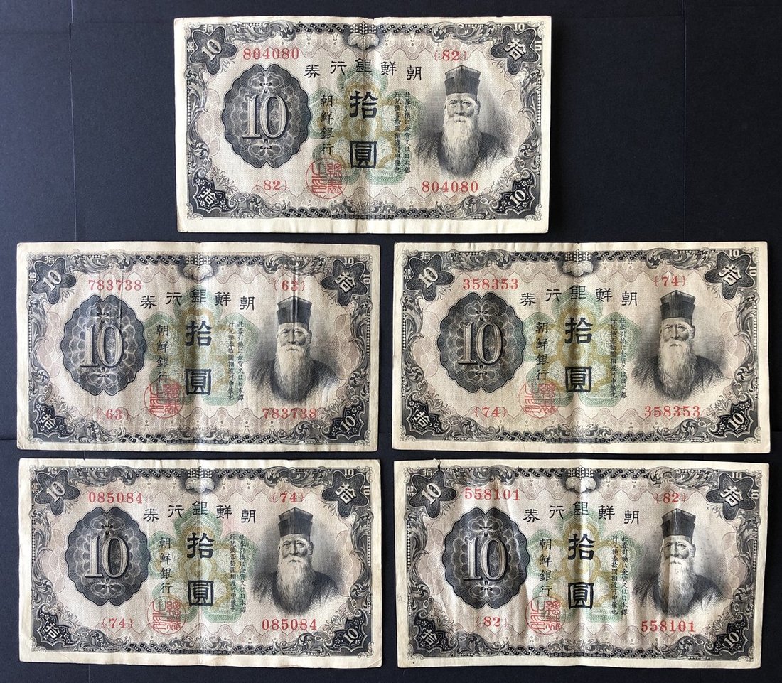 1932, Bank of Chosen, group of 5x 10 Yen, serial numbers 085084, 783738, 804080, 558101 and 358353, (Pick 31), about very fine.