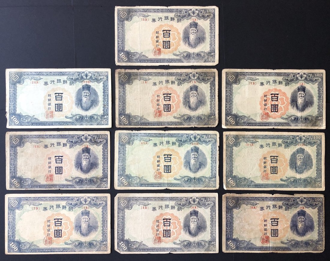 1945及1947年朝鮮銀行券100元10枚一組,1945年7枚為日元,1947年3枚為韓圜,F品相。