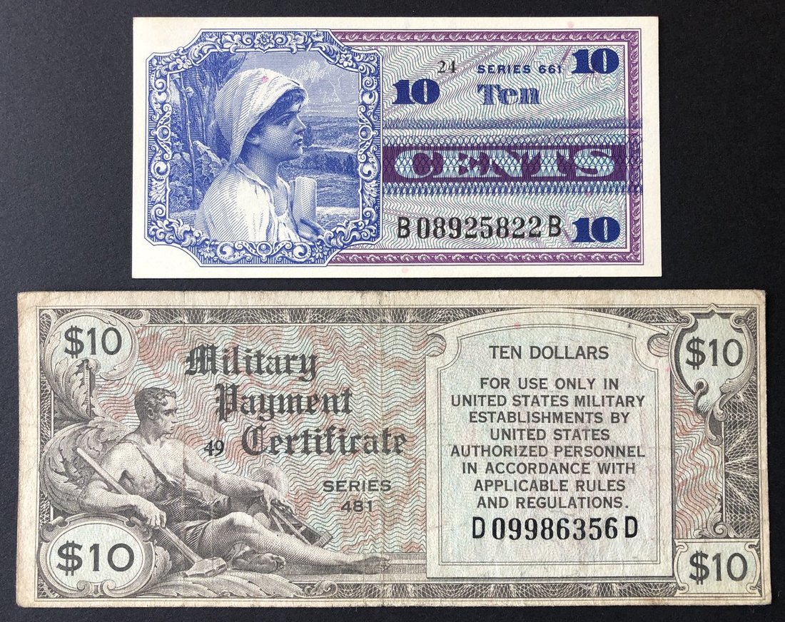 1951-1954年年美國軍用票10元,481系列,編號D09986356D,以及1968年1角,661系列,編號B08925822B,前者VF品相,後者UNC品相,紙邊有微黃。