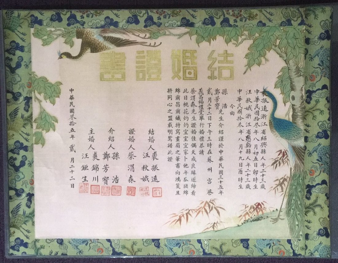 1946 One roll of Marriage Certificate, Wedding Ceremony held in Shanghai, nicely designed, hand painted, silk-paper certificate, with Bride, Bridegroom, Witness, introduction person and Wedding ceremony officiator's seals