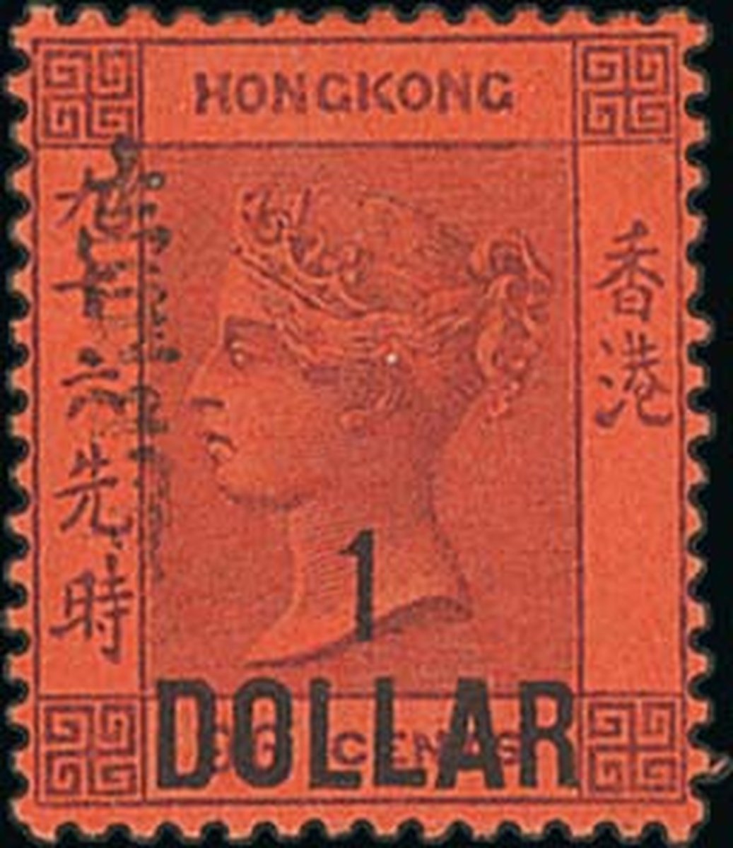 $1 on 96c. purple on red, two examples, one with very faint Chinese handstamp and the second showing bend to the Chinese "one", part to large part original gum. Fresh and fine. S.G. 50, £900+. Photo