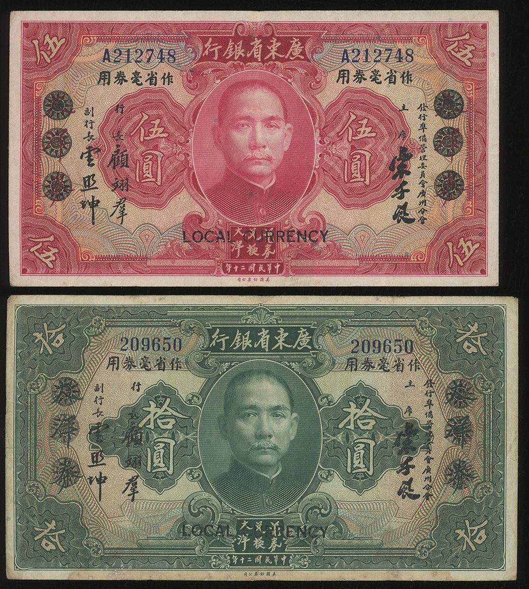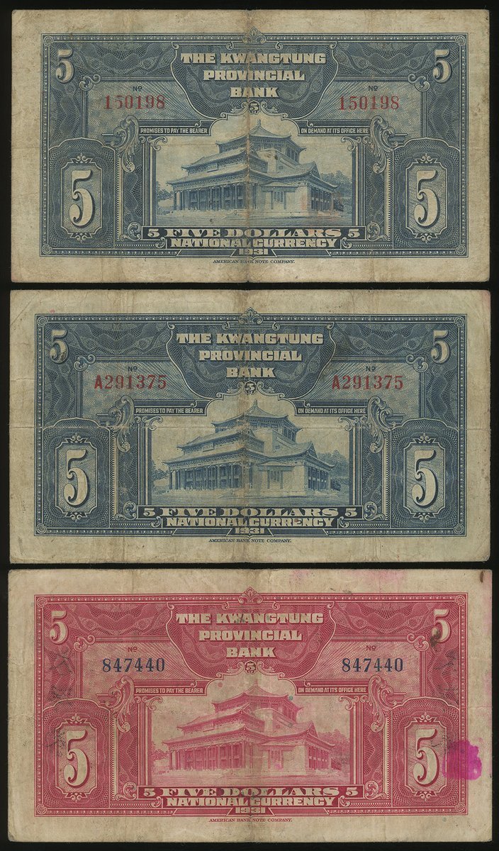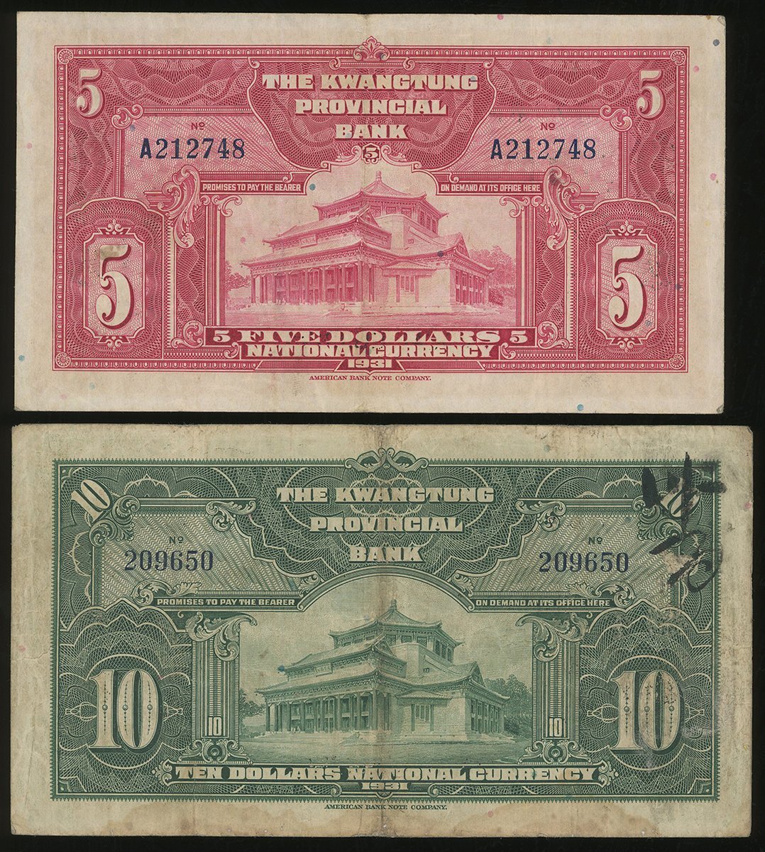 1931年廣東省銀行一組7枚,5元4枚及10元3枚,VF品相