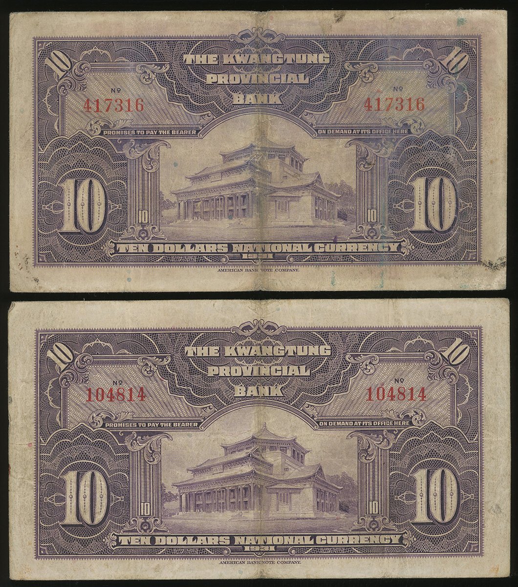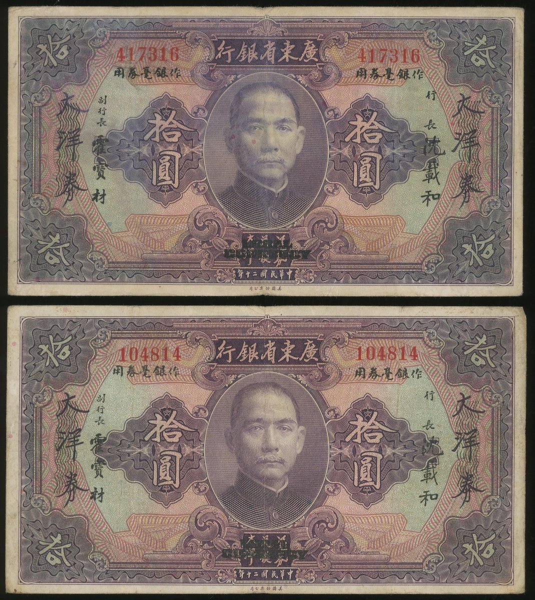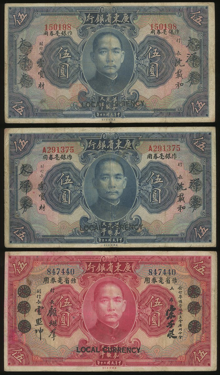 1931年廣東省銀行一組7枚,5元4枚及10元3枚,VF品相