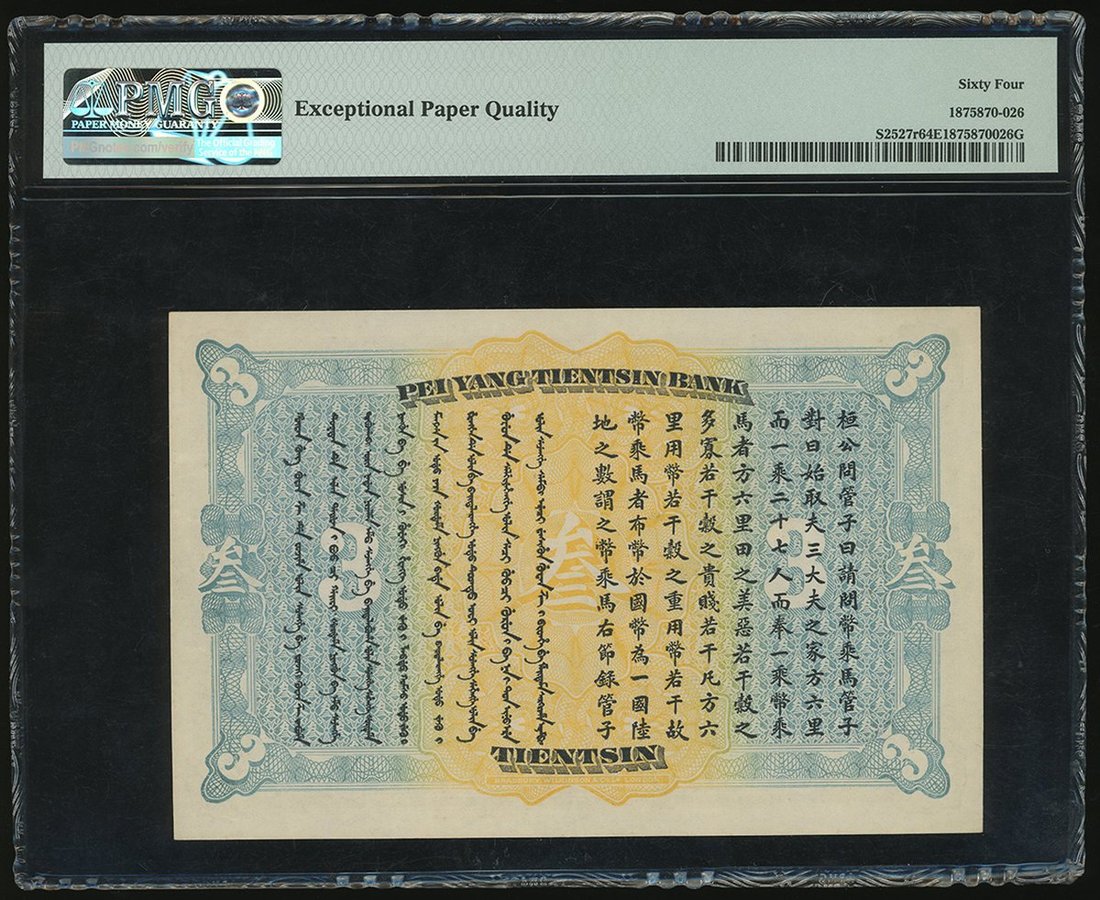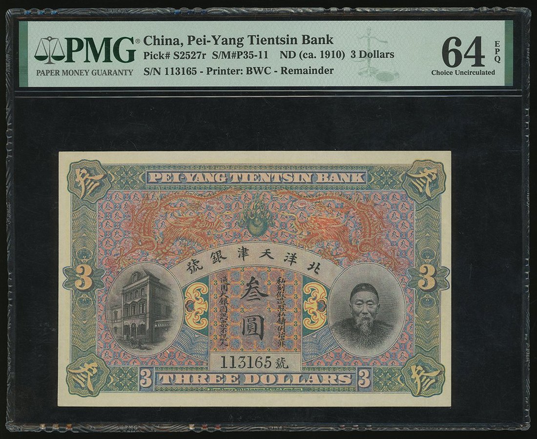 Pei Yang Tientsin Bank, $3, remainder, ND (ca. 1910), serial number 113165, (Pick S2527r), PMG 64EPQ Choice Uncircuiated