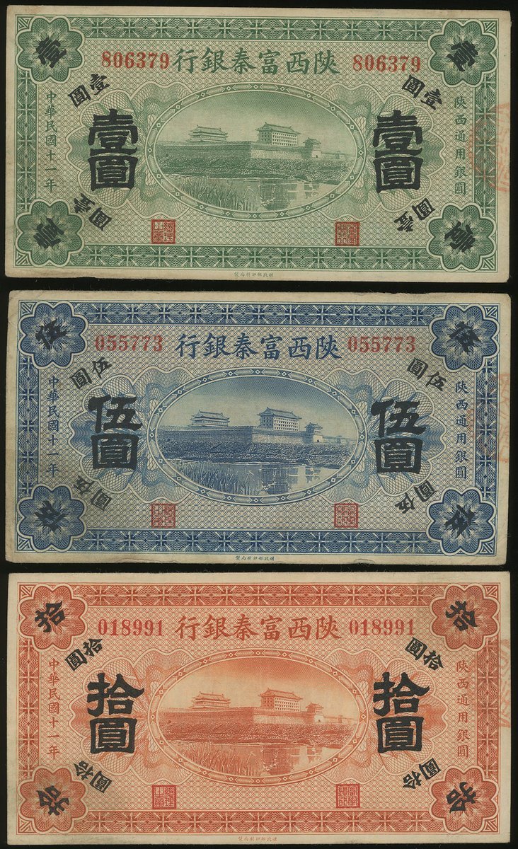 1922年陝西富秦銀行1、5、10元3枚一組,均AVF品相