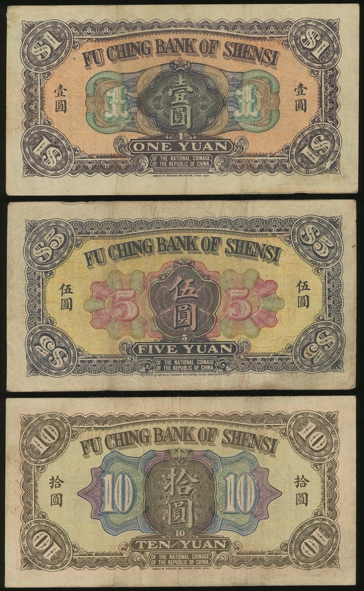 Fu Ching Bank of Shensi, 1, 5 and 10 Yuan, 1922, serial numbers 806379, 055773 and 018991, (Pick S2600, S2600A, S2600B), about very fine (3)
