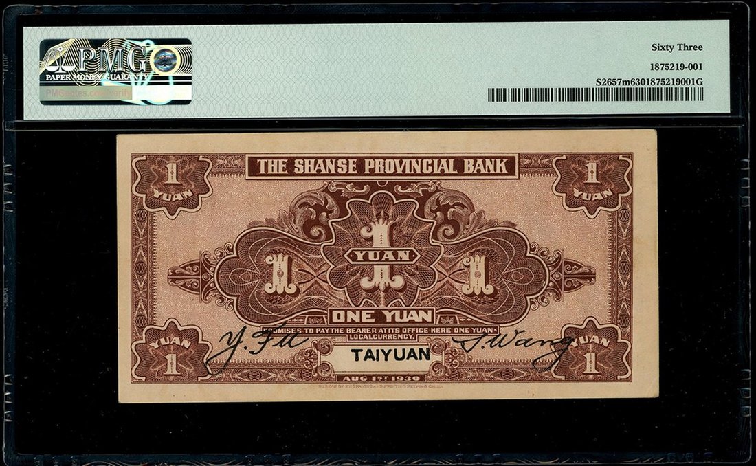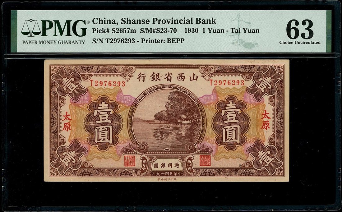 The Shanse Provincial Bank, 1 Yuan, Taiyuan, 1930, serial number T2976293, (Pick S2657m), PMG 63 Choice Uncirculated