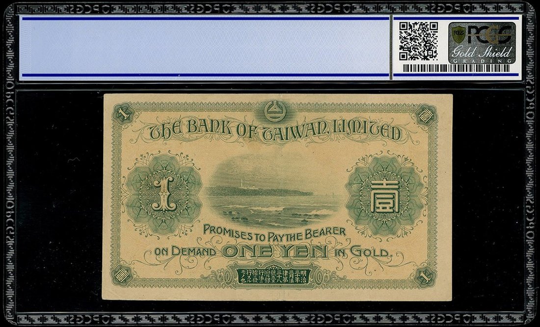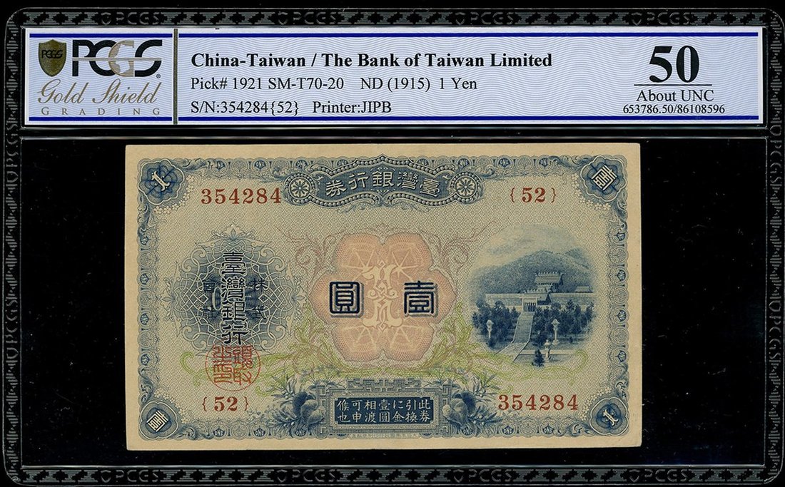 Bank of Taiwan, 1 Yen, ND (1915), serial number {52} 354284, (Pick 1921), PCGS Gold Shield 50 About Uncirculated