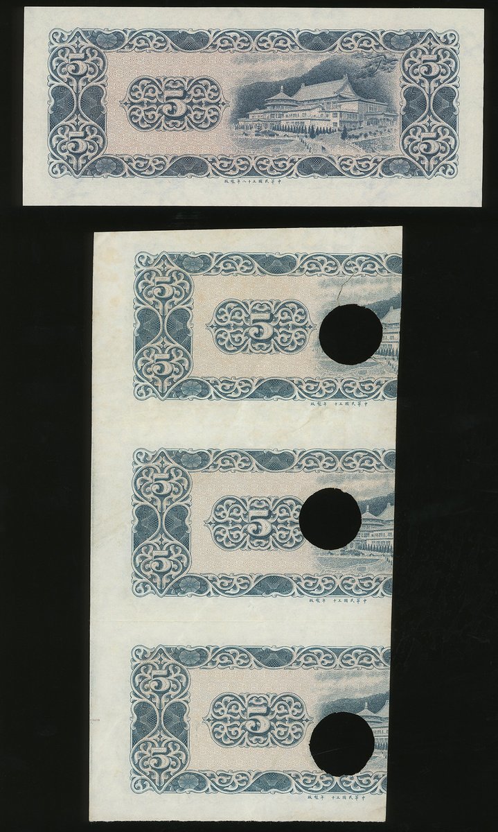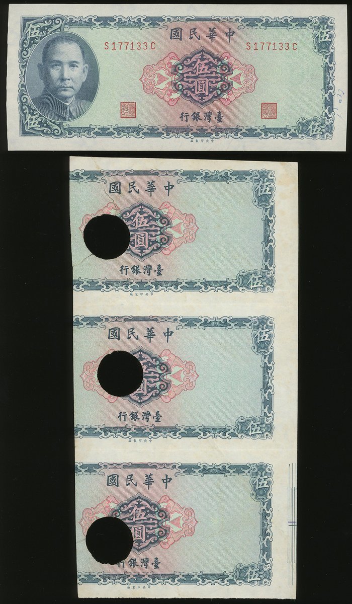 Bank of Taiwan, an uncut sheet of 3x 5 Yuan proof notes, 1/3 of the left side cut, hole punch cancelled, series of 1969, also an issued version of the same 5 Yuan, 1969, serial number S177133C,