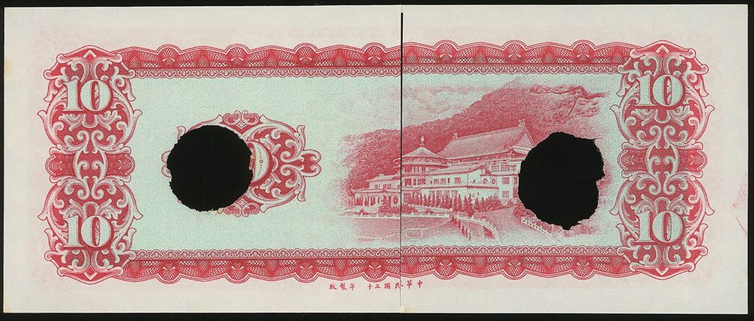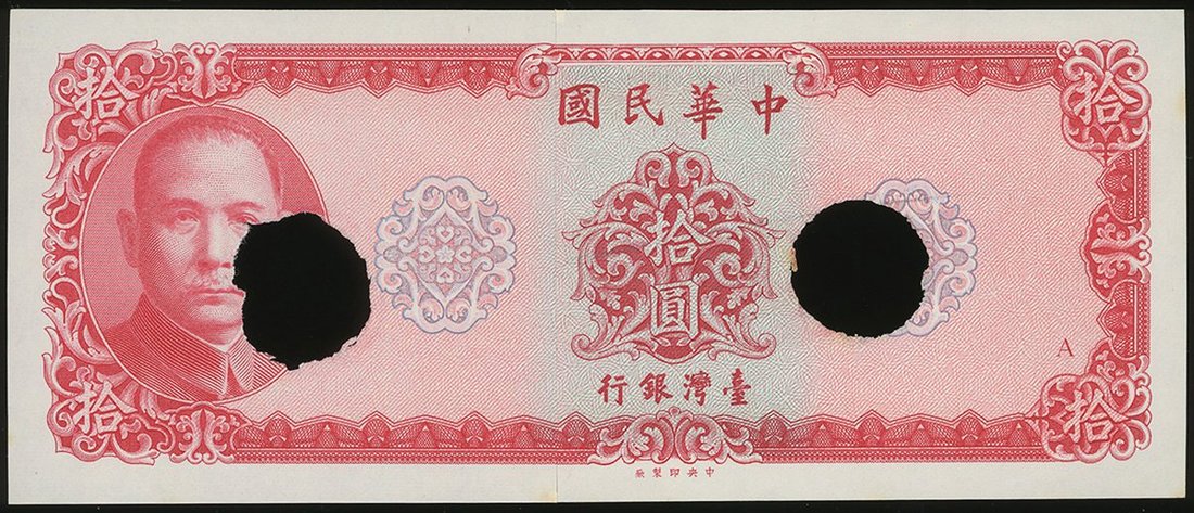 Bank of Taiwan, 10 Yuan, proof with two large hole punch cancellation, series of 1969, cut and rejoined at centre,