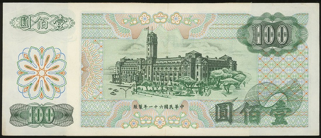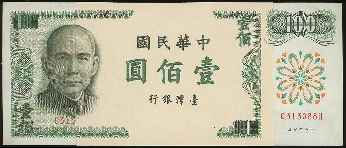 Bank of Taiwan, 100 Yuan, 1972, partial obverse progressive proof mounted on a circulated note with serial number Q313088H, (Pick 1977), almost uncirculated to uncirculated. The partially printed progressive proof rare. The cataloguer has not seen this format on note from other countries in this format.